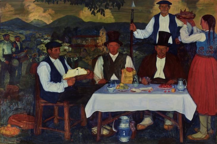 “Autoridades de mi aldea” es una obra llena de contrastes. Los personajes del primer plano son fundamentalmente hieráticos y están pintados con mucho detalle. La vajilla, las telas y las frutas están representadas a la manera de la pintura flamenca del siglo XVI. En cambio, en los planos del fondo, se imponen el movimiento y la irrealidad. Frente al silencio de los comensales sentados a la mesa, la música de los txistularis; frente al brillo y la nitidez del jarro, un pueblo encantador e imaginario como sacado de un cuento.